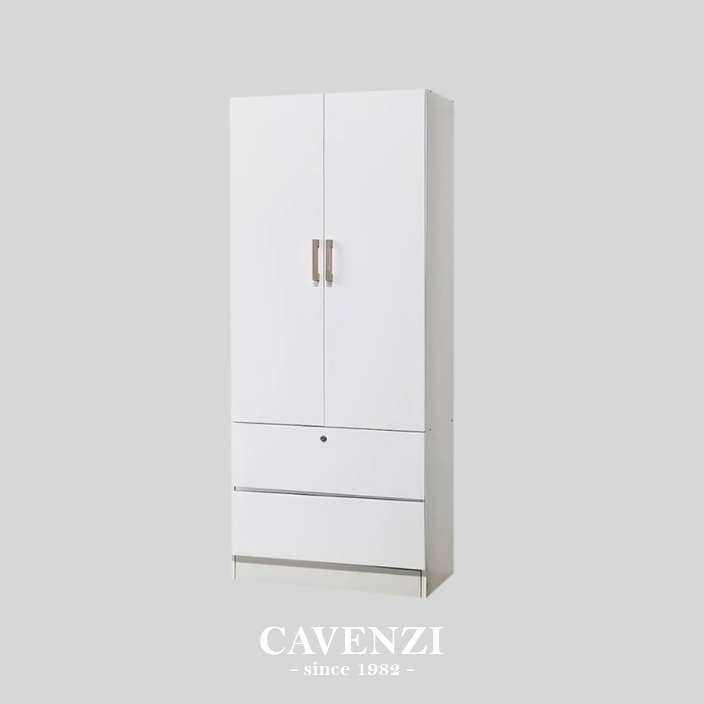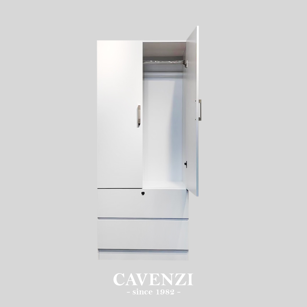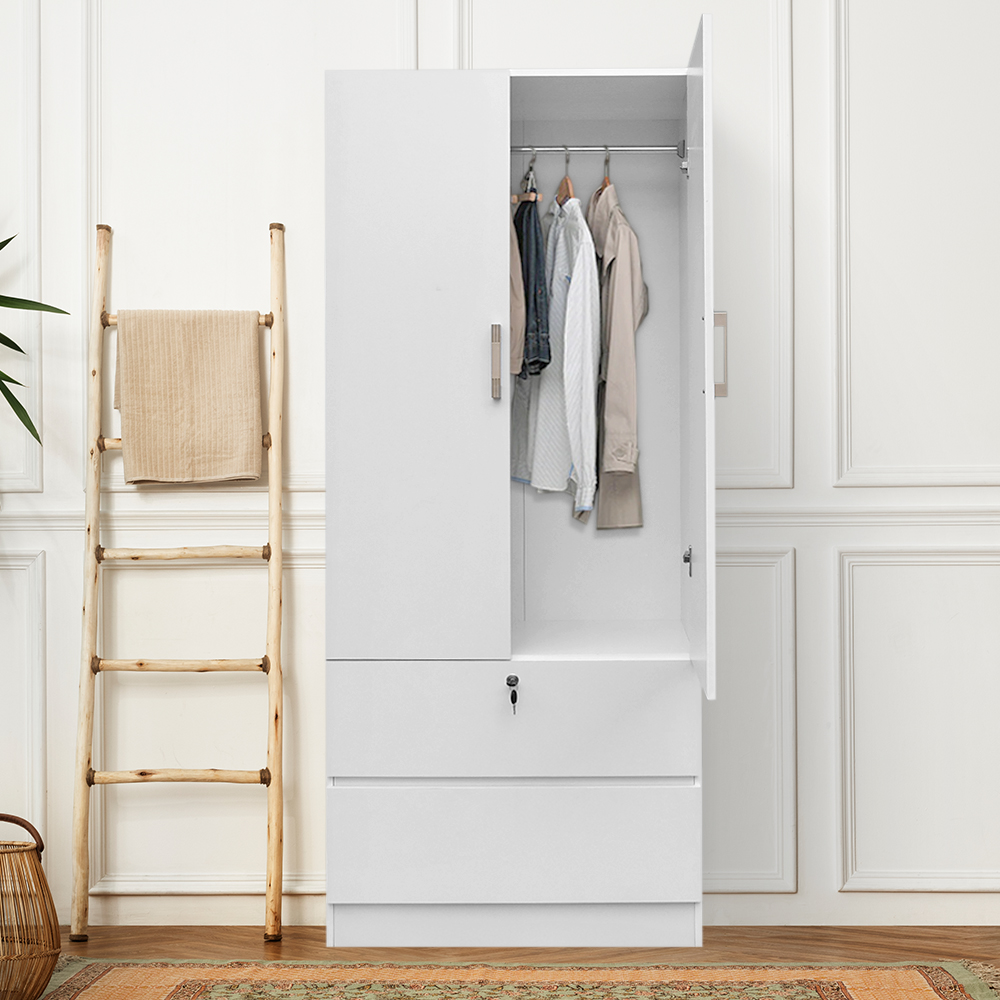 A sleek and compact wardrobe featuring 2 doors and 2 spacious drawers, perfect for organizing your clothes and essentials. Its all-white finish offers a clean, minimalist look that blends effortlessly with any bedroom style.
